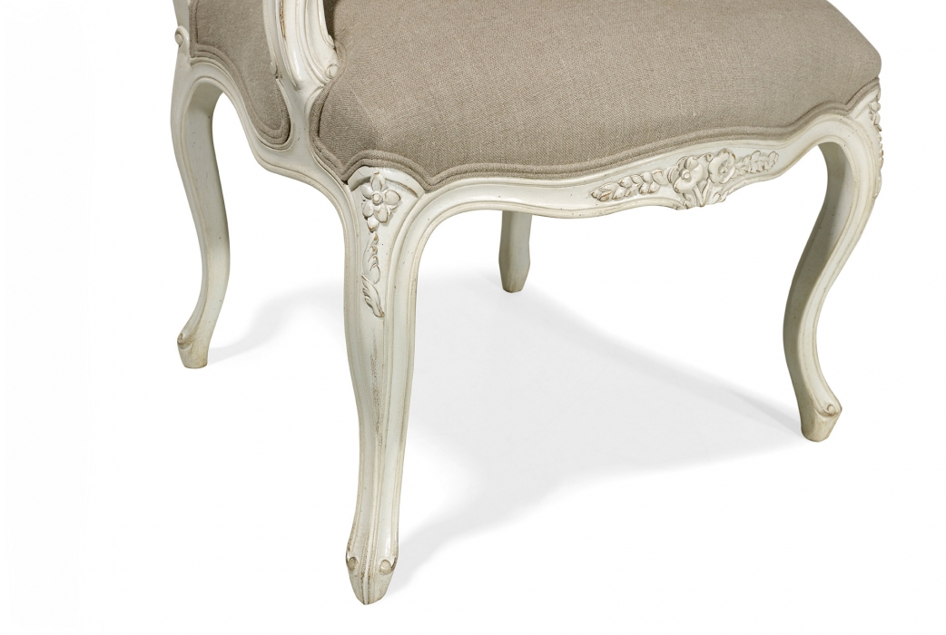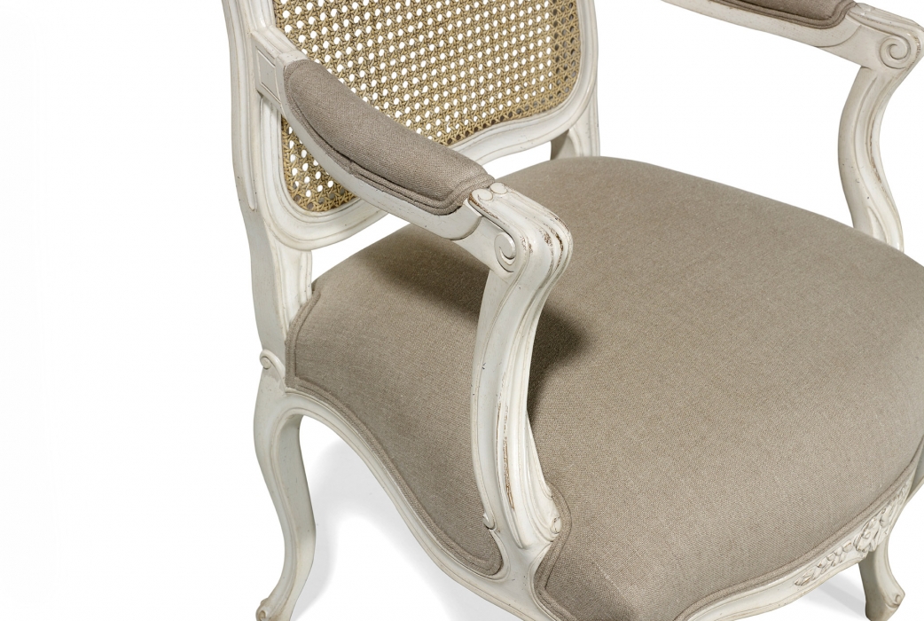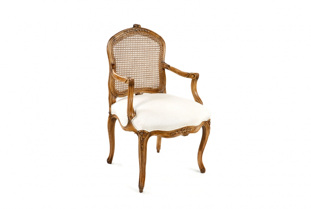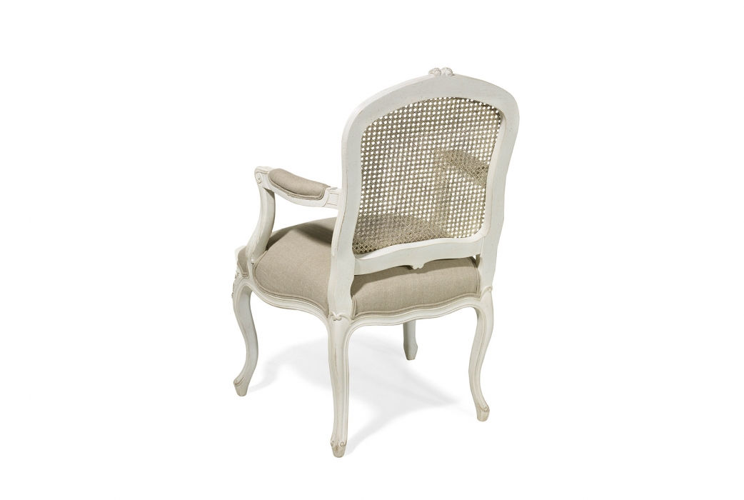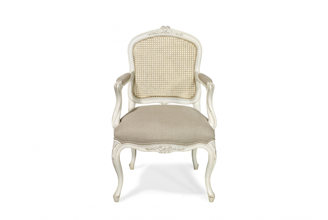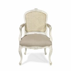 Ghế ăn Cecile Louis XV được làm bằng gỗ Anh đào với lớp hoàn thiện màu Trắng. Lưu ý mặt sau đóng hộp và chi tiết hoa chạm khắc bằng tay tinh xảo trên khung gỗ của nó.